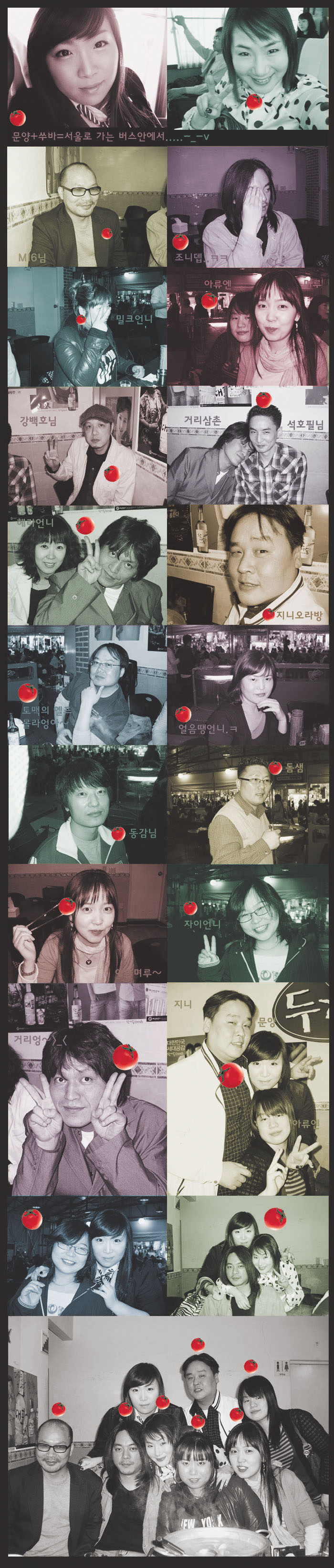 잼있당....난 토마토귀걸이를 했고 MI6님과 백호님은 토마토뱃지달고 거리삼촌은 토마토핀했당...며루는 토마토를 젓가락으로....기술좋은데....^^ 조니뎁님과 쑤바 문양=삼각관계 다들 넘 잘어울리네....그날 조니뎁님 장가못간다고 사진빼시더니 많이 나오시넹....