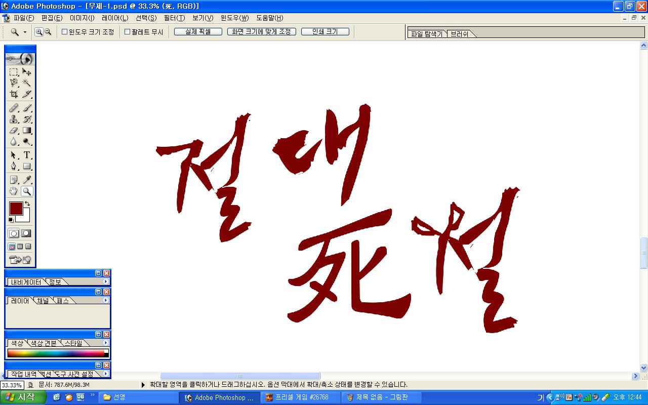 정중히 캘리 부탁드립니다. -_- 류재철 일반 0 5797 2009.11.16 11:18 실력자 분들이 많이 계셔서 이렇게 염치없게 부탁드립니다. - 절대死절 : 첨부한 파일 참고해주시면 감사하겠습니다.(약간 거친느낌? ^^;;) : '절'자의 ㅈ은 가위로...^^;; : 포스터 제작용이라 ai 파일이 필요합니다. 대학동아리 연극공연 포스터로 쓸 예정입니다. 비상업적인 공연이라 이렇게 부탁드립니다.